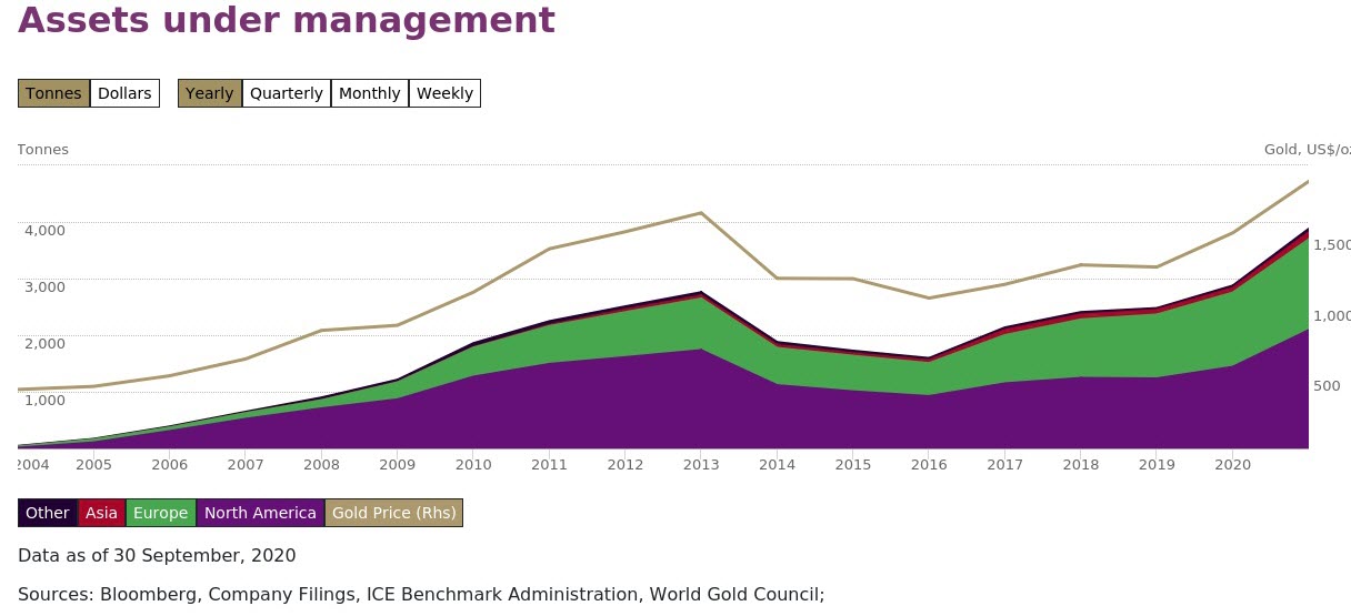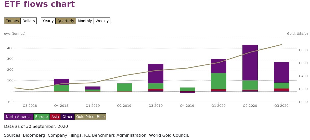 حيث أضافت خلال الربع الثالث ما يقارب 273 طناً أو ما يقارب 16.4 مليار دولار أمريكي في الأصول حيث أنهى سعر الذهب بارتفاع على ارتفاع 7٪ تقريباً خلال نفس الفترة، وظلت أموال أمريكا الشمالية هي المتلقي الأساسي للتدفقات الوافدة.
