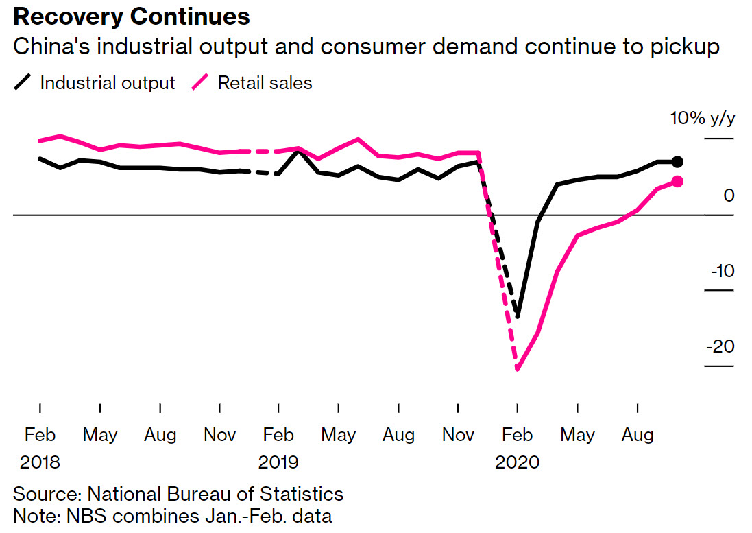 أظهرت البيانات الصينية هذا الأسبوع أن التعافي الاقتصادي للبلاد تعزز في أكتوبر مع ارتفاع الإنفاق الاستهلاكي بشكل مطّرد وزيادة الإنتاج الصناعي والاستثمار بشكل أسرع من المتوقع.