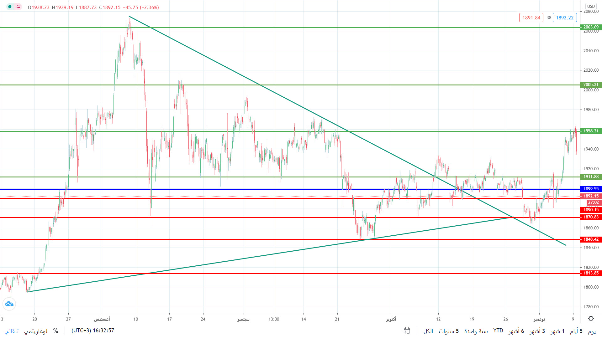 مع الاخبار الواردة بخصوص لقاح فيروس كورونا وضعت ضغط على أسعار الذهب مع تراجع المخاطر ليتراجع بمقدار 3% ويتداول دون مستوى 1912، وهو ما عزز ن التراجع للتداول دون مستوى 1900 حيث يواجه دعم أولي عند مستوى 1890 دولاراً للأونصة.