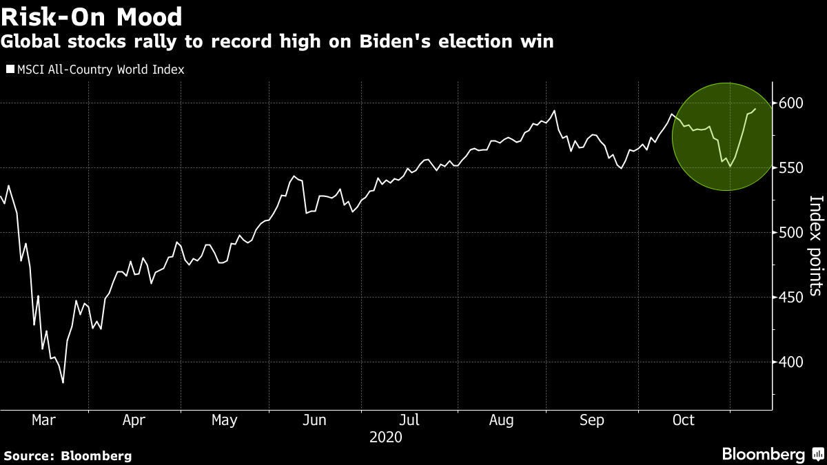 حيث قفزت الأسهم العالمية إلى مستوى قياسي وسط تفاؤل بشأن توقعات الأصول الخطرة خلال رئاسة “جو بايدن”، وارتفع مؤشر “MSCI” لجميع الأسهم العالمية بنسبة أكثر من 1٪ اليوم الاثنين متجاوزاً أعلى مستوى منذ أكثر من شهرين عند 595.24 في 3 سبتمبر.