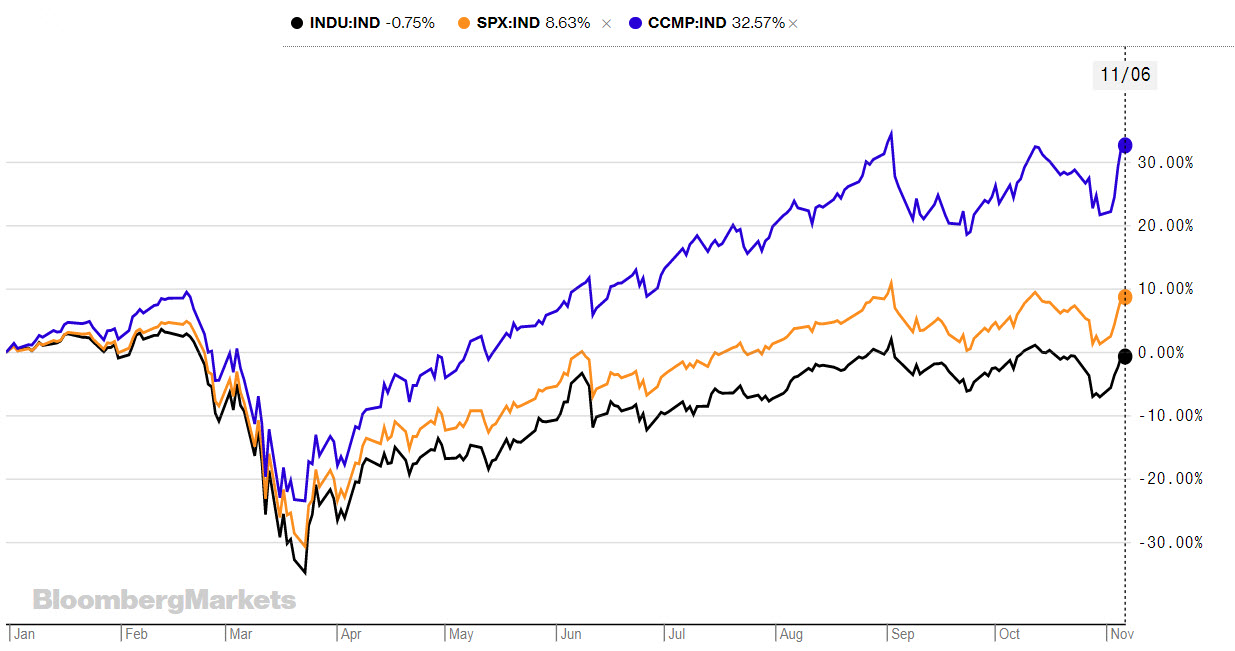 حيث تصاعد الاًصوات لصالح المرشح الديمقراطي في الأسبوع الماضي أنهت الأسواق الأمريكية تداولاتها بإيجابية مع ارتفاع مؤشر “داو جونز” بنسبة 6.9٪ وارتفع مؤشر “ستاندرد آند بورز 500” 7.3٪ وقفز مؤشر “ناسداك” 9٪.