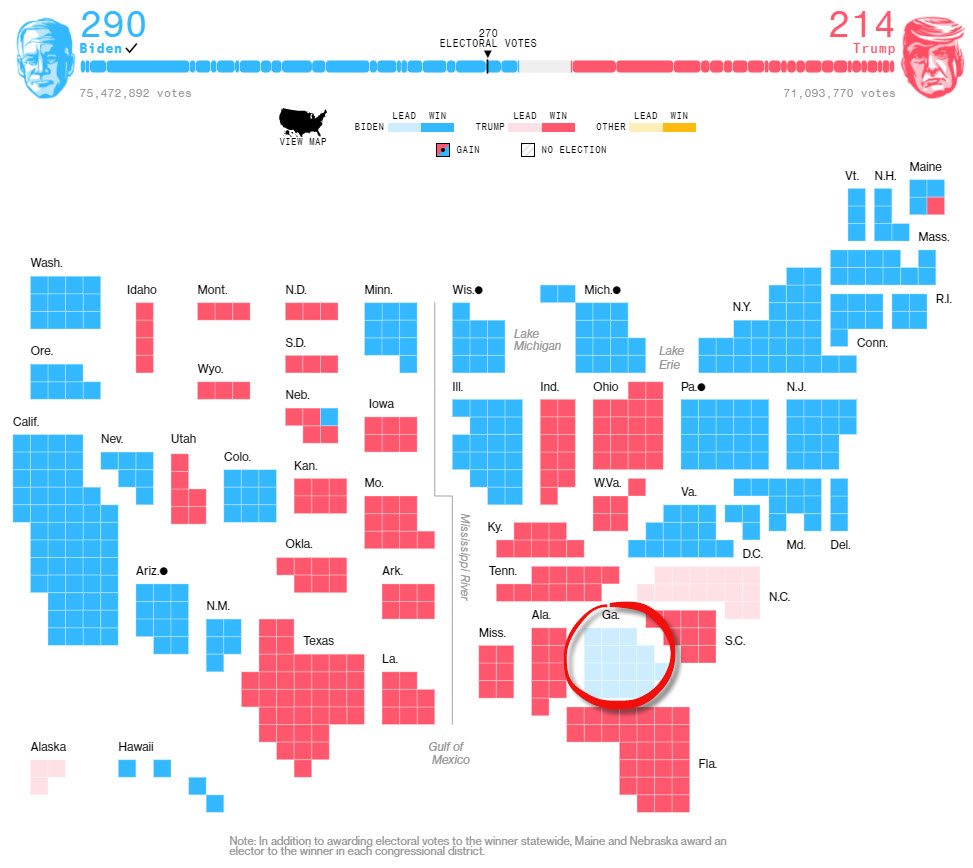 بينما خسر المرشح الجهوري والرئيس السابق “دونالد ترامب” بعد حصوله على عدد أصوات 214 صوت مجمع انتخابي، وكانت هناك ولاية جورجيا لم تحدد الفائز بها حيث سيتم بها فرز من جديد لعدم تجاوز نسبة الأصوات 1% بين المرشحين.