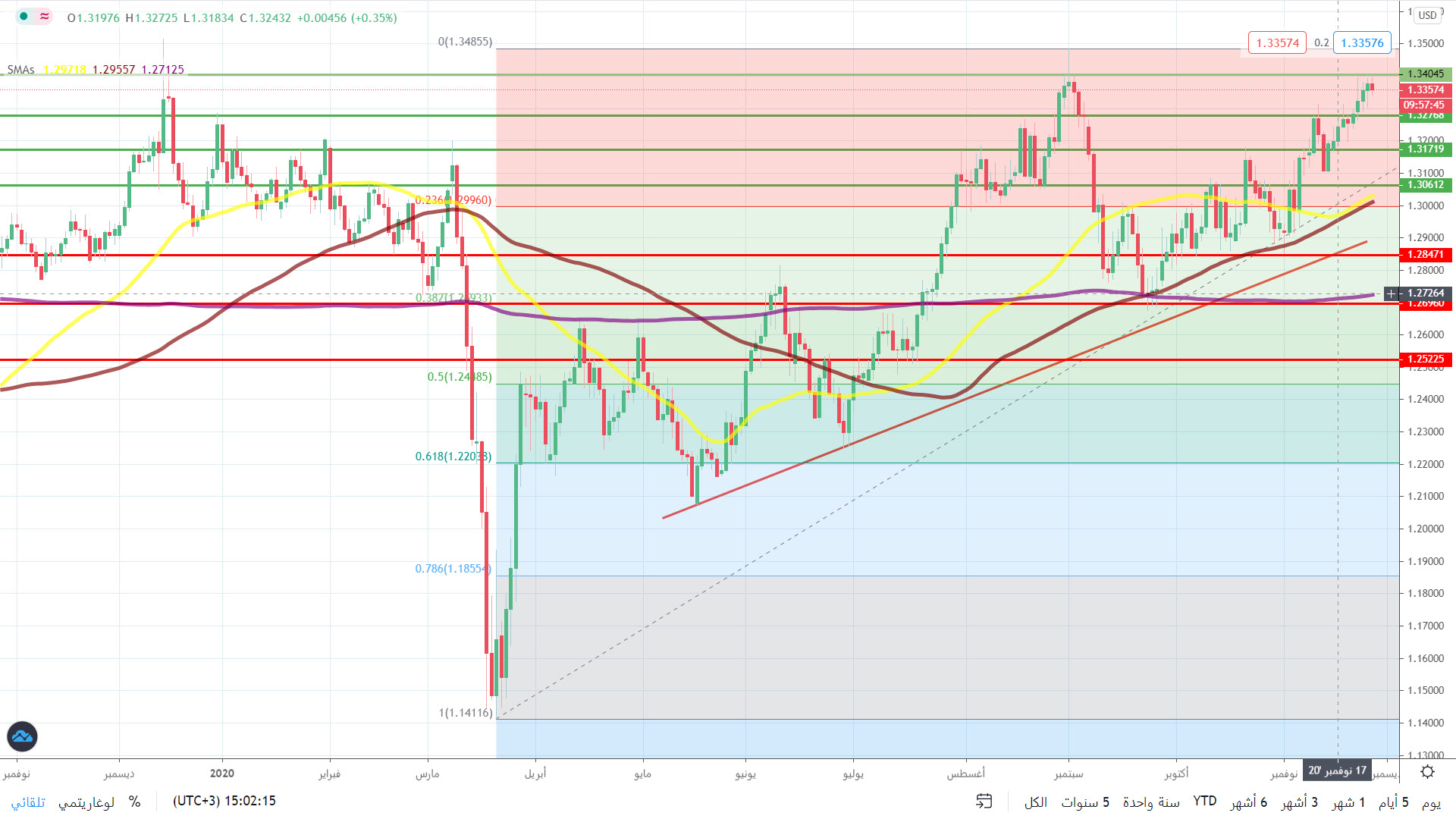 يتداول الجنيه الإسترليني على تراجع طفيف بعد أن حقق أعلى مستوى له منذ بداية سبتمبر مقابل الدولار عند 1.3397. وهذا مع تفاؤل لقاح كورونا المرتقب واستمرار محادثات التجارة بعد البريكست.
