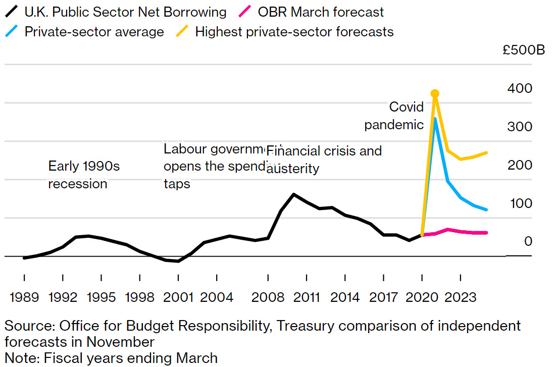 كما من المتوقع أن تقترض المملكة المتحدة 394 مليار جنيه إسترليني هذا العام، وهذا ما يعادل 19٪ من الناتج المحلي الإجمالي، أي أعلى مستوى مسجل في وقت السلم.