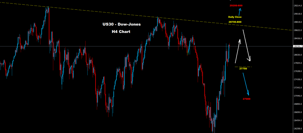 كما نرى على الرسم البياني الجديد فإن الداو سيواجه مستويات مقاومة حول مناطق 800-28700 والتي قد تدفع بموجة تراجع جديدة بالسوق لمناطق 27750 و 27000
