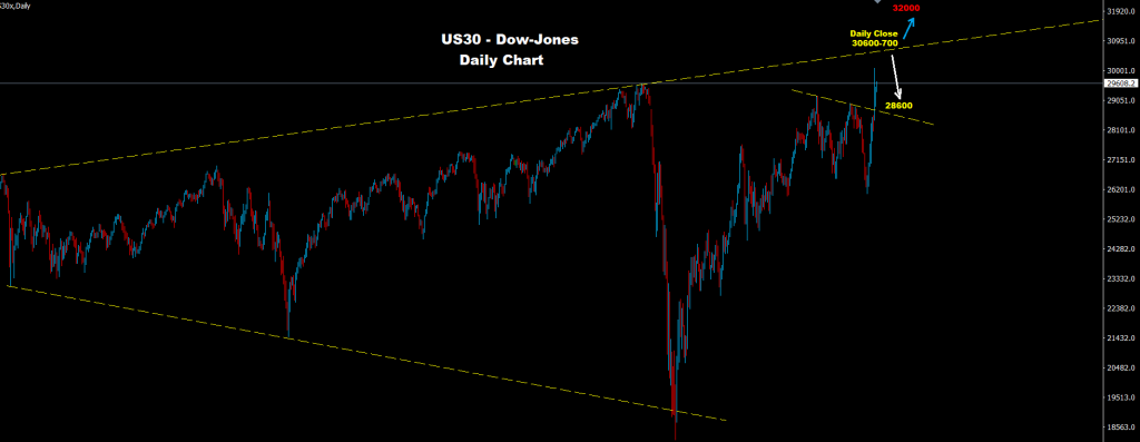 لا يزال مؤشر الداو يحافظ على مؤشرات صعود قوية بالسوق في حين لا زلنا بانتظار اختبار مناطق 700-30600