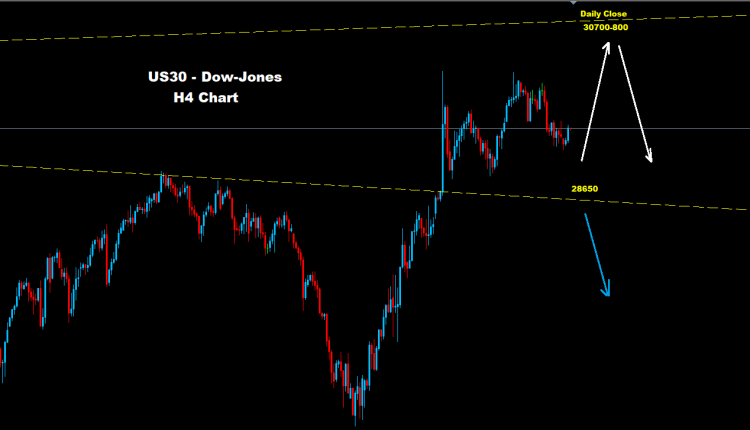 كما نرى على الرسم البياني وطالما السوق متماسك فوق مستويات 28860 فإن موجة الصعود لا تزال قائمة نحو مناطق الهدف 700-30600 والتي بدورها قد تدفع بموجة تراجع جديدة على السوق نحو مناطق 28600
