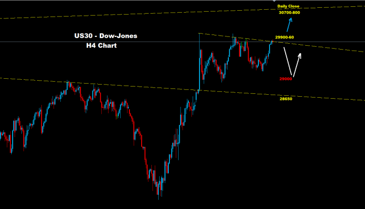 فوق مستويات 29960 فإن فرص استمرار الموجة الصاعدة الحالية قد تستمر نحو أهداف المدى القصير لمستويات 700-30600
