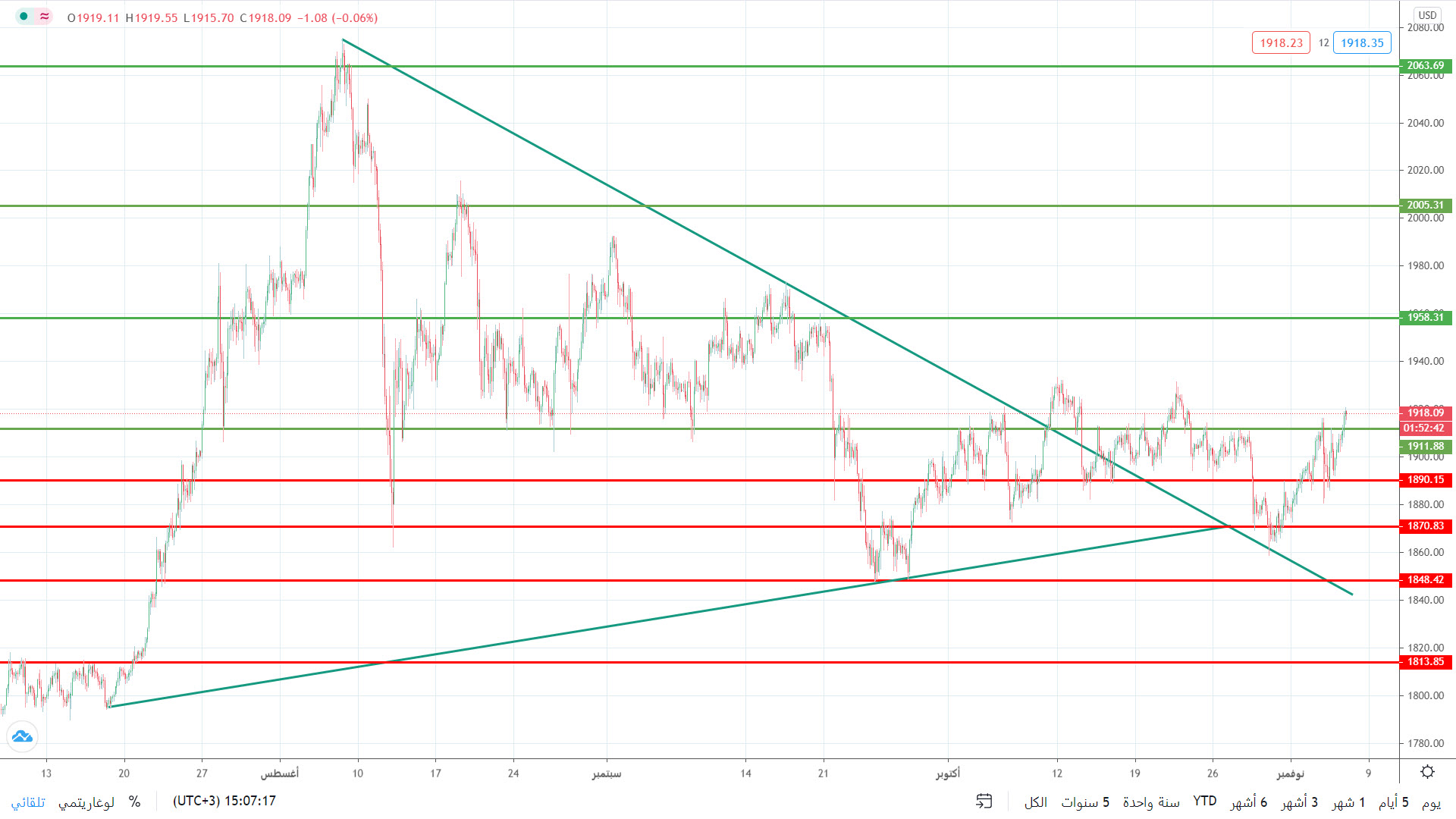 بينما في حالة فقدان الزخم والعودة للتداول دون مستوى 1900 دولاراً للأونصة قد يواجه دعم أول عند مستوى 1987، وباختراق هذا المستوى سيكون الدعم الثاني عند مستوى 1965 دولاراً لأونصة أما دون هذا المستوى قد يتراجع نحو مستويات 1848 دولاراً للأونصة قاع سبتمبر.