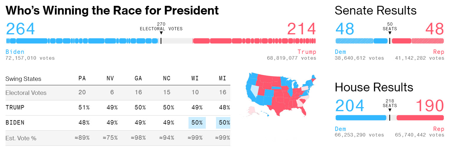تصدر “جو بايدن” بـ 264 صوتاً بالمجمع الانتخابي بعد فوزه في ولايتي ويسكونسن وميتشيغان، وهو معدل تاريخي للأصوات تجاوز 72 مليون بينما حصد “دونالد ترامب” 214 صوتاً.