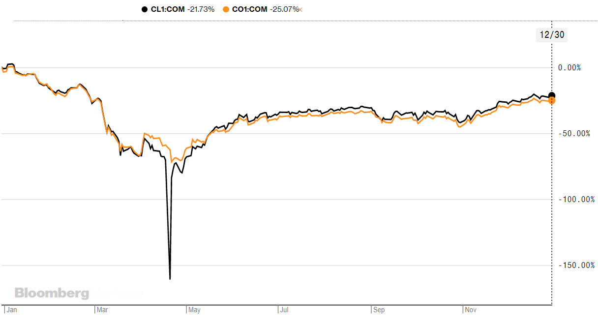 فمع قرب نهاية العام، تقترب أسعار النفط أن تنهي خسائرها على تراجع أقل منذ بداية الجائحة. وهذا مع اقتراب النفط الخام من انهاء تداولاته في 2020 على تراجع يقارب بنسبة 21٪ منذ يناير، بينما نفط برنت يقترب من إنهاء العام على خسائر تقارب بنسبة 25٪.