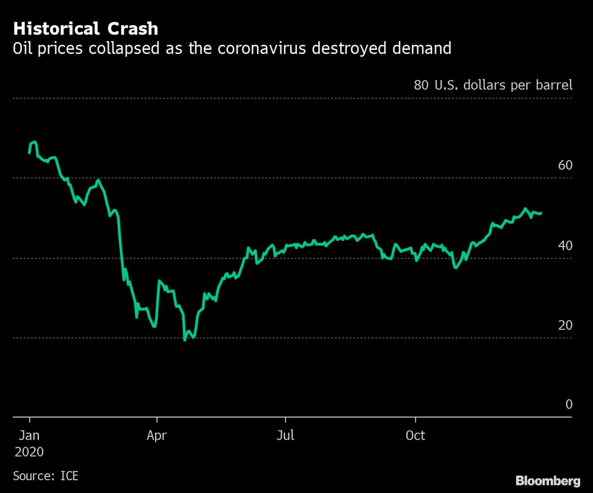 تعرض سوق النفط لضغوط هائلة في عام 2020 حيث تسببت جائحة كورونا في تراجع الطلب العالمي، والذي أدى لتراجع أسعار نفط برنت ما يقارب 72٪. أما النفط الخام، فتراجع بأكثر من 160٪ حتى أبريل مع ظهور تخمة تاريخية.