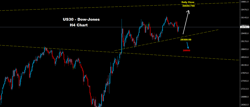 كما نرى على الرسم البياني وطالما السوق يحافظ على تداولاته فوق مستويات 50-29300 فإن فرص التقدم و الارتفاع ستستمر نحو مستويات 30250 و 750-30650