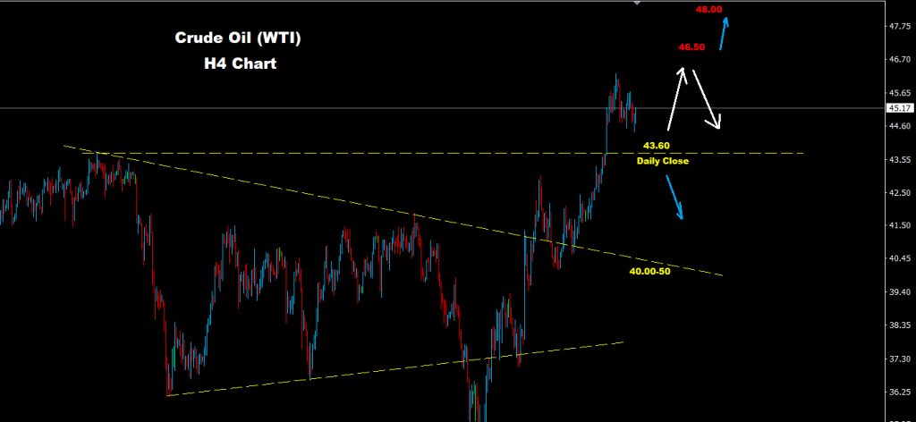 كما نرى على الرسم البياني فإن النفط الخام يواجه مستويات دعم على مناطق 60-43.00 حيث طالما الإغلاق اليومي مستمر فوق هذه المستويات فإن موجة الصعود ستستمر بالسوق مع حواجز مقاومة على أسعار 46.50 و 48.00