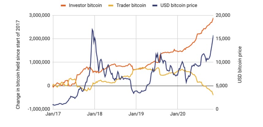 يوضح الرسم البياني التالي الفكرة التي أرغب في توصيلها، حيث ن الخط البرتقالي يوضح عدد المستثمرين في البيتكوين وهو في ارتفاع مستمر، مقابل الخط الأصفر الذي يمثل عدد الوحدات المطروحة للتداول والذي هو في اتجاه هابط منذ منتصف 2019.