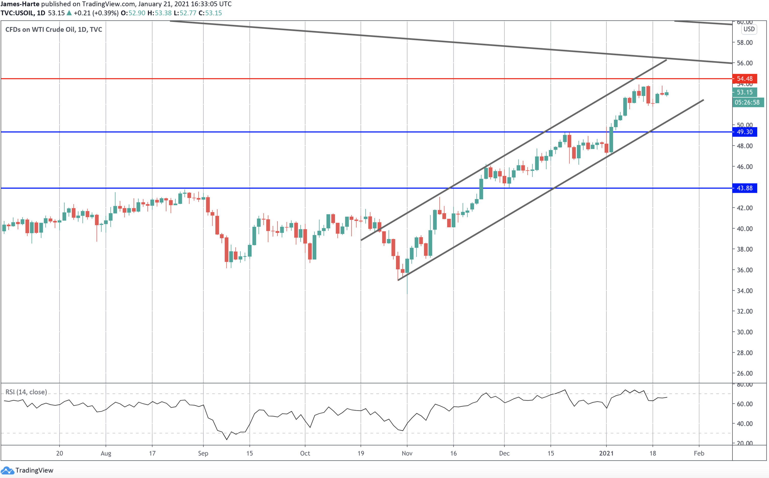 تواصل أسعار النفط الخام تداولها ضمن قناة صاعدة ضيقة، حيث يقترب السعر من مستوى المقاومة عند ٥٤.٤٨.