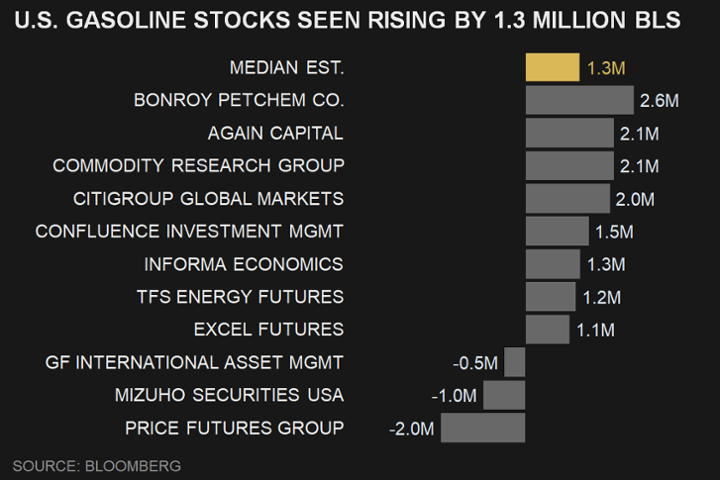 ووفقاً لمتوسط تقديرات السوق وبلومبرج إن مخزونات النفط الخام الأمريكية قد تتراجع إلى مقدار 1.5 مليون برميل الأسبوع الماضي مقارنة بالتقدير السابق عند 4.4 مليون برميل.