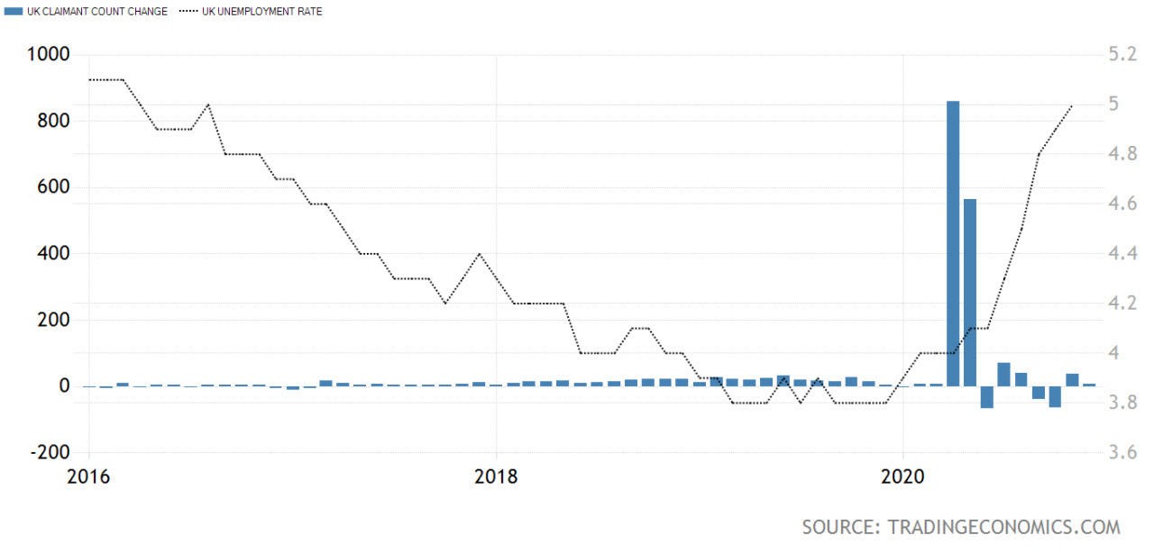 يعتبر هذا الشهر الخامس على التوالي من ارتفاع معدل البطالة إلى مستوى مرتفع جديد منذ أغسطس 2016. وهو أعلى مستوى منذ تصويت البريكست، حيث أعيد تطبيق عدد من إجراءات الإغلاق المتعلقة بفيروس كورونا.