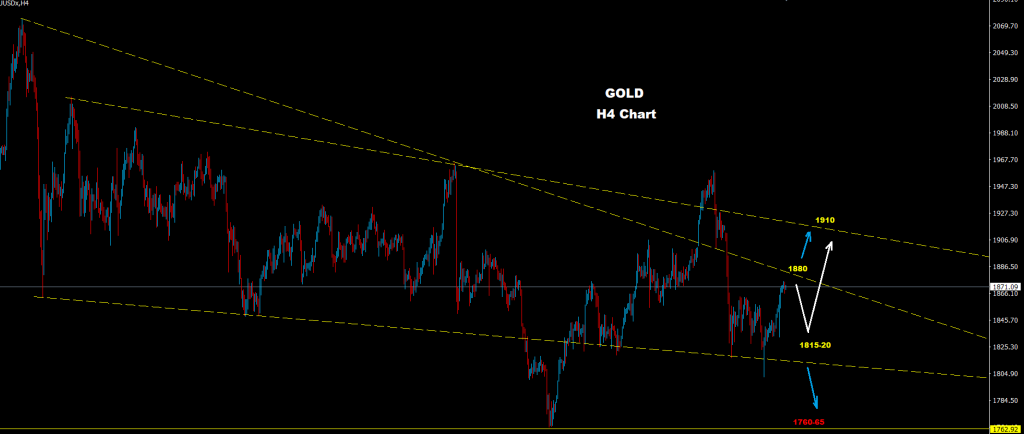 كما نرى على الرسم البياني فإن المدى اليومي يرى مستويات مقاومة حول مناطق 1880 والتي طالما تحافظ على تداولات السوق تحتها فإن فرص تراجع تصحيحي لمستويات 20-1815 ستكون متوقعه قبل عودة موجة الصعود لاستهداف مستويات 1910