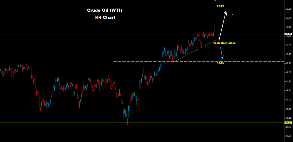 كما نرى على الرسم البياني فإن المدى اليومي و المدى القصير لا يزال يرى مستويات الدعم لمناطق 47.30 الحاسمه ما بين استمرار الصعود او التوجه لتراجع تصحيحي، وطالما السوق يحافظ على إغلاقاته اليومية فوق مستويات 47.30 فإن الأهداف السعرية ستستمر لمناطق 54.50