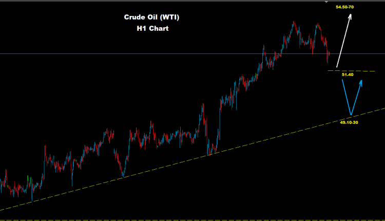 كما نرى على الرسم البياني للمدى اليومي فإن السوق يواجه مستويات دعم حول مناطق 51.40 حيث وطالما السوق متماسك فوقها فإن موجة الصعود مستمرة نحو أهداف 70-54.50
