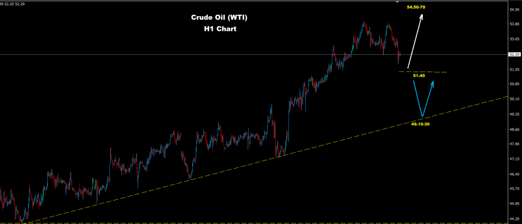 كما نرى على الرسم البياني للمدى اليومي فإن السوق يواجه مستويات دعم حول مناطق 51.40 حيث وطالما السوق متماسك فوقها فإن موجة الصعود مستمرة نحو أهداف 70-54.50