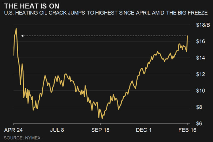أدى البرد القارس إلى تجميد عمليات الآبار وقطع الطاقة في جميع أنحاء وسط الولايات المتحدة، وارتفع النفط الخام بنسبة 1٪ إلى 60.65 دولاراً للبرميل كما أضاف نفط برنت أكثر من 1.2٪ إلى 64.15 دولاراً للبرميل.