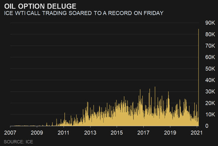 حيث ارتفع تداول سوق الخيارات مع شراء خام غرب تكساس الوسيط المستخدم لوضع رهانات صاعدة إلى مستوى قياسي يوم الجمعة، والذي عزز أهداف النفط على المدى الطويل نحو مستويات 100 دولاراً للبرميل.