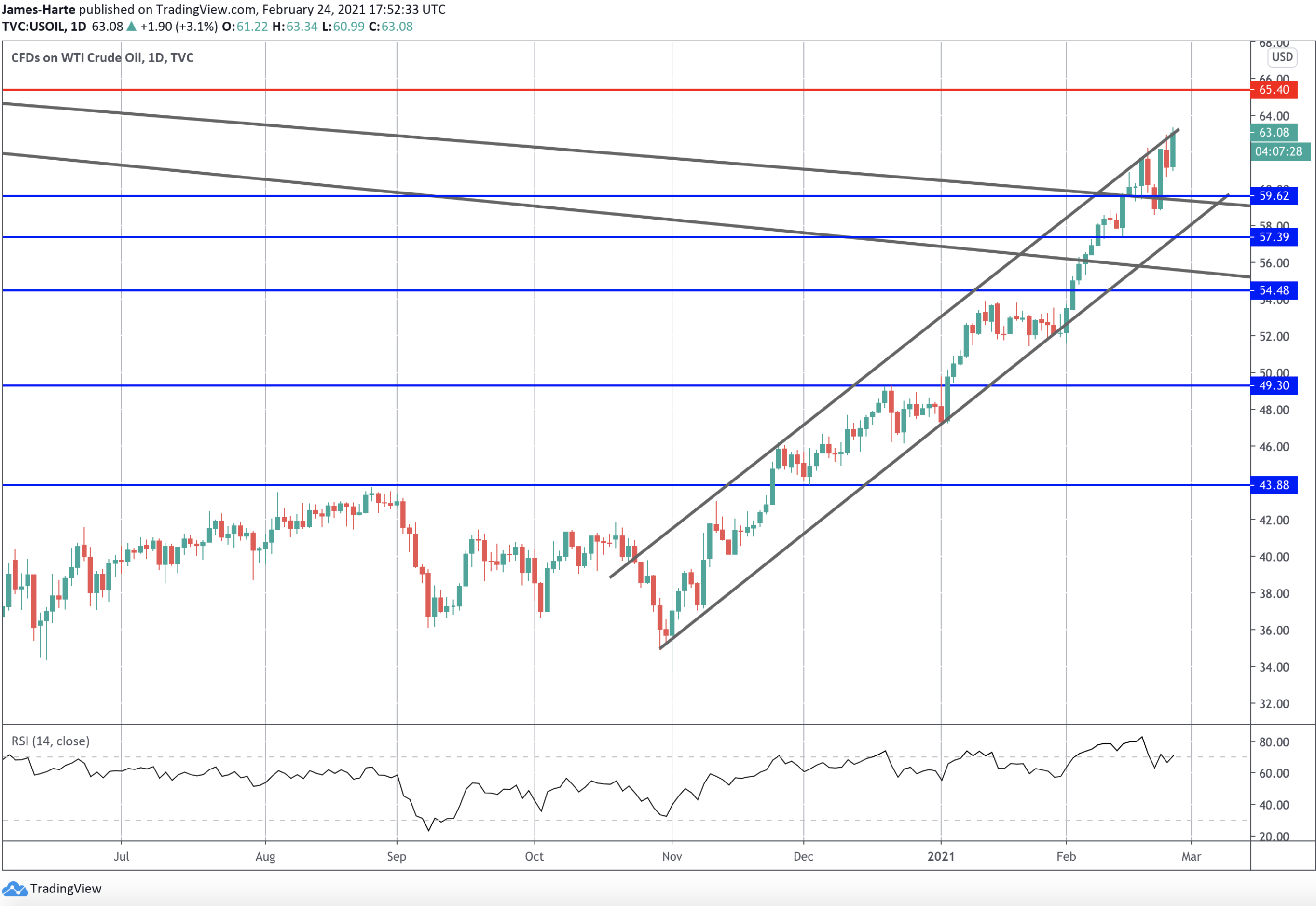 وجدت أسعار النفط الخام دعماً عند إعادة اختبار المستوى ٥٩.٦٢ هذا الأسبوع وعادت للصعود نحو الأعلى مرة أخرى منذ ذلك الحين. واخترق السعر الآن أعلى مستوى له منذ ٢٠١٨ ويختبر حالياً قمة القناة الصاعدة الممتدة من أدنى مستويات عام ٢٠٢٠. وبينما يستقر السعر فوق المستوى ٥٩.٦٢ ، يبقى التحيز إيجابياً مع التركيز على اختبار المستوى التالي عند ٦٥.٤٠.