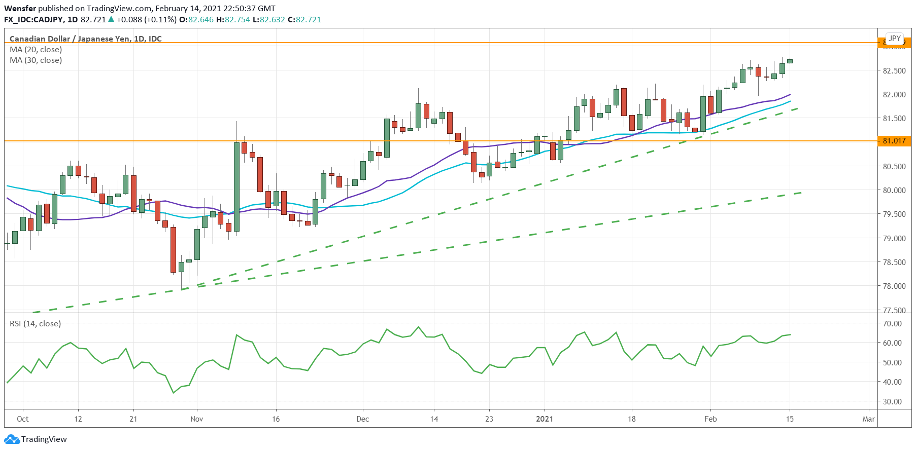 وسوف يستمر الاتجاه الصاعد طالما بقيت حركة السعر فوق المستوى النفسي ٨١.٠٠. وإذا تغلب الزوج على العقبة المتوسطة عند ٨٣.٠٠، فإن الهدف التالي سيكون أعلى مستوى سجله الزوج في فبراير الماضي عند ٨٤.٦٠.