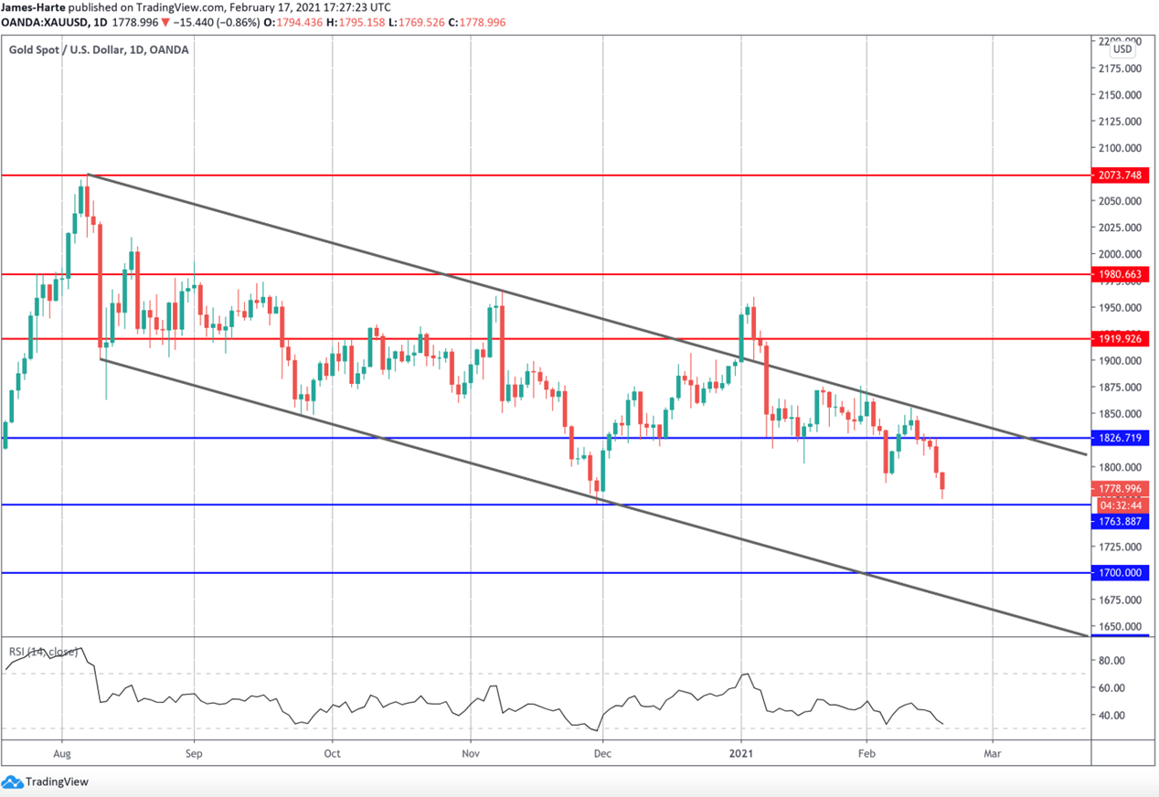 لقد كان أسبوعاً مخيباً للآمال لمشتري الذهب. ففي أعقاب موجة الانتعاش الذي شهدها الأسبوع الأول من فبراير، عاد سوق الذهب إلى المبيعات الصافية هذا الأسبوع مع تراجع أسعار الذهب من أعلى مستوياتها التي حققتها حول منتصف المستوى ١٨٢٦ في بداية الأسبوع، إلى أدنى مستوياتها في المتوسط ١٧٧٩ تقريباً حتى كتابة هذا التقرير. ويقترب السعر الآن بسرعة من أدنى مستوياته في ديسمبر ٢٠٢٠.