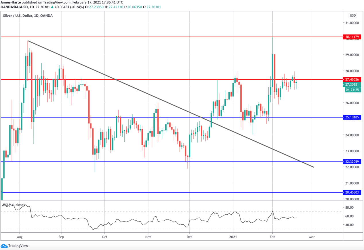 على الرغم من عمليات البيع المكثفة في الذهب وارتفاع الدولار الأمريكي هذا الأسبوع، بقيت أسعار الفضة مدعومة بشكل جيد بالقرب من الارتفاعات الأخيرة التي شهدتها. وشهد سوق الفضة تداولاً مزدحماً مؤخراً وعانى من أجل اتخاذ حركة اتجاهية هذا الأسبوع. بيد أن الفضة تجنب الاختراق السلبي كما حدث في الذهب، ويرتبط هذا على الأرجح بتحسن توقعات الطلب وسط الانتعاش الاقتصادي المزدهر في الولايات المتحدة. وفي وقت لاحق من هذا الأسبوع، سوف يتطلع المتداولون إلى الجولة التالية من قراءات التصنيع التي سترد من الولايات المتحدة والمملكة المتحدة ومنطقة اليورو والتي من المحتمل أن تقدم المزيد من الدعم لأسعار الفضة.
