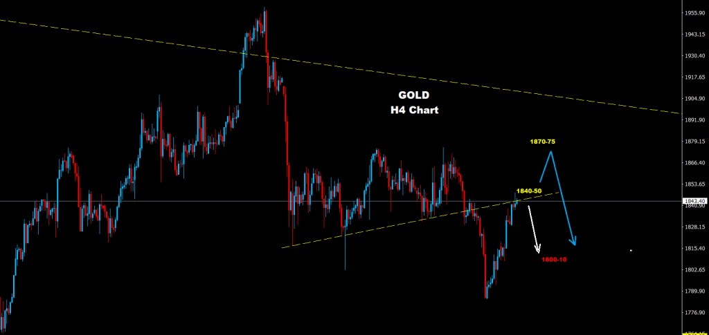 كما نرى على الرسم البياني فإن السوق لا يزال يختبر مناطق المقاومة للترند حول مستويات 50-1840 حيث يواجه السوق احد الاحتمالات القادمة:
