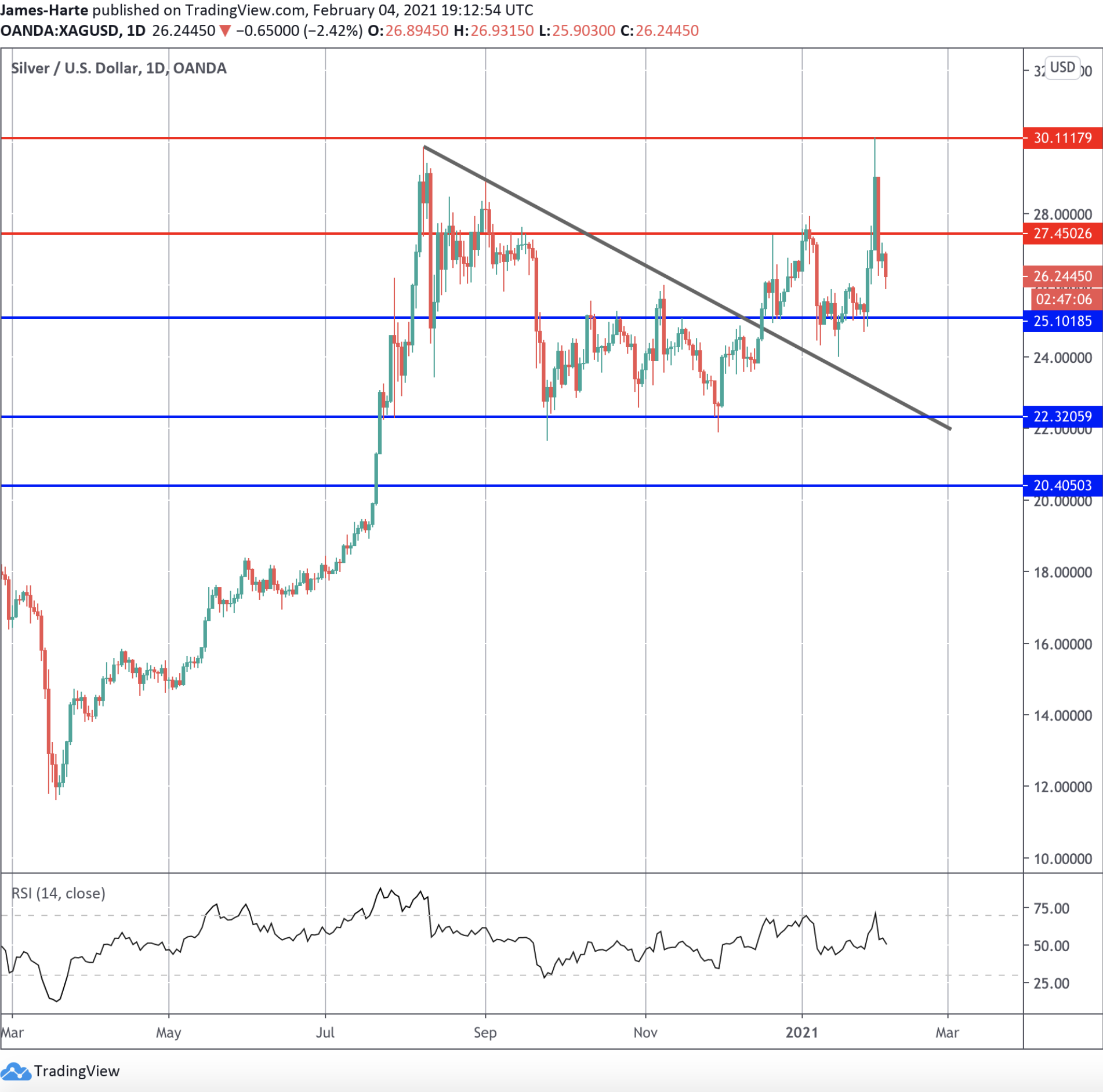 اخترقت أسعار الفضة لفترة وجيزة المستوى ٣٠.١١٧ هذا الأسبوع قبل أن تتعرض لضغوط بيع دفعتها إلى الانخفاض من جديد.