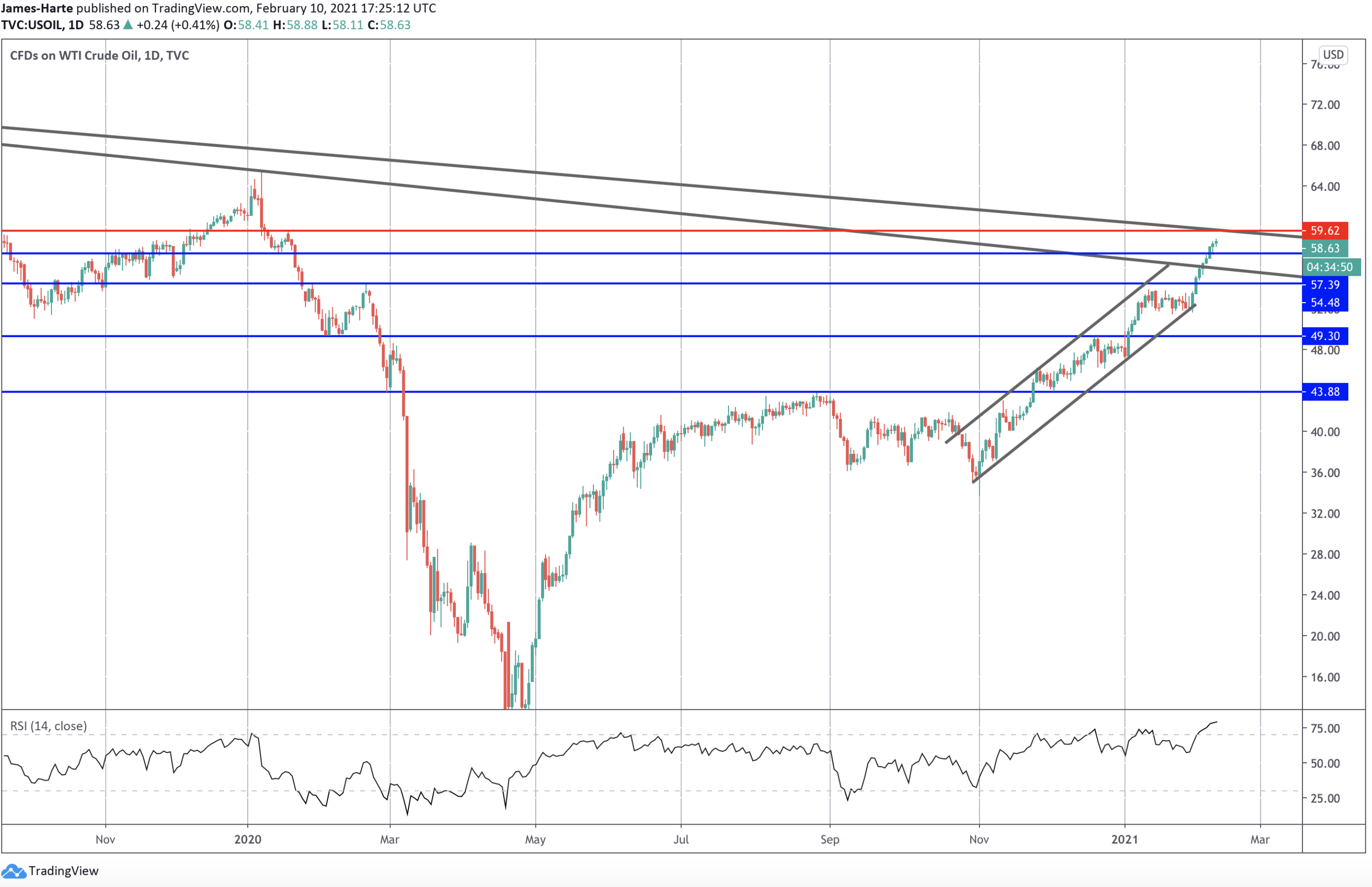 إذ تجاوز السعر أعلى خط الاتجاه الهابط من أعلى مستويات ٢٠١٨. ويقترب الآن بشكل سريع من خط الاتجاه الهابط طويل المدى حول مستوى ٥٩.٦٢ حيث لدينا كذلك مقاومة هيكلية.