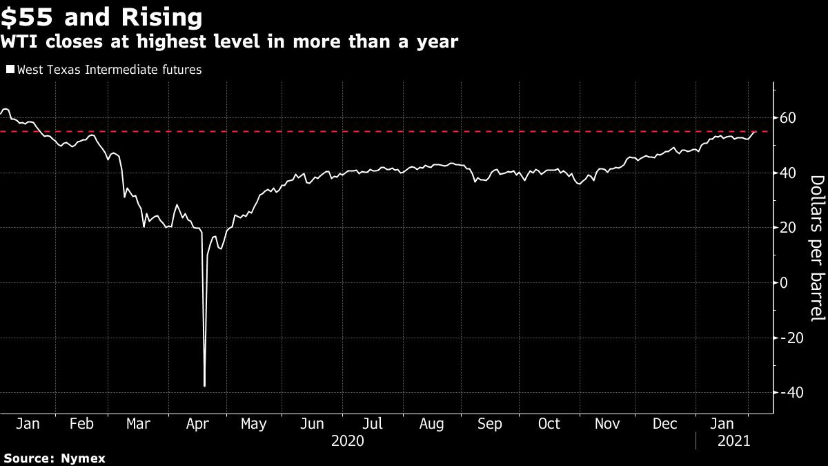 ارتفعت العقود الآجلة لأسعار النفط الخام أعلى مستوى 55 دولاراً للبرميل بعد أن قفزت بنسبة 5٪ تقريباً خلال الجلستين السابقتين بالتزامن مع ارتفاع أوسع في الأسواق المالية، وهو أعلى مستوى منذ 23 يناير 2020.