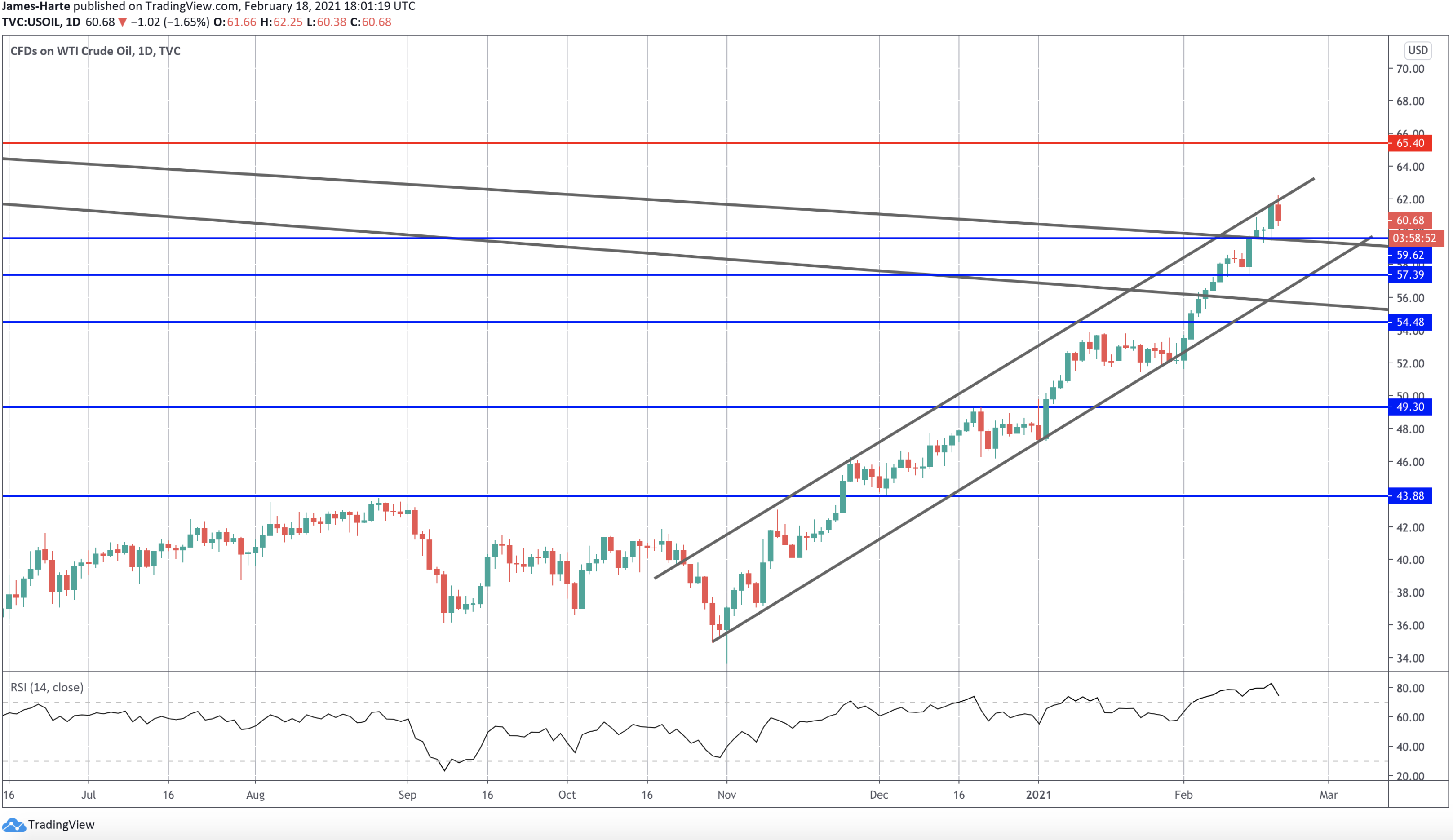 لقد حدث تطوراً تقنياً هاماً في أسعار النفط الخام هذا الأسبوع. إذ تجاوز السوق أعلى خط الاتجاه الهابط من أعلى مستويات عام ٢٠١٤ والمستوى ٥٩.٦٢.
