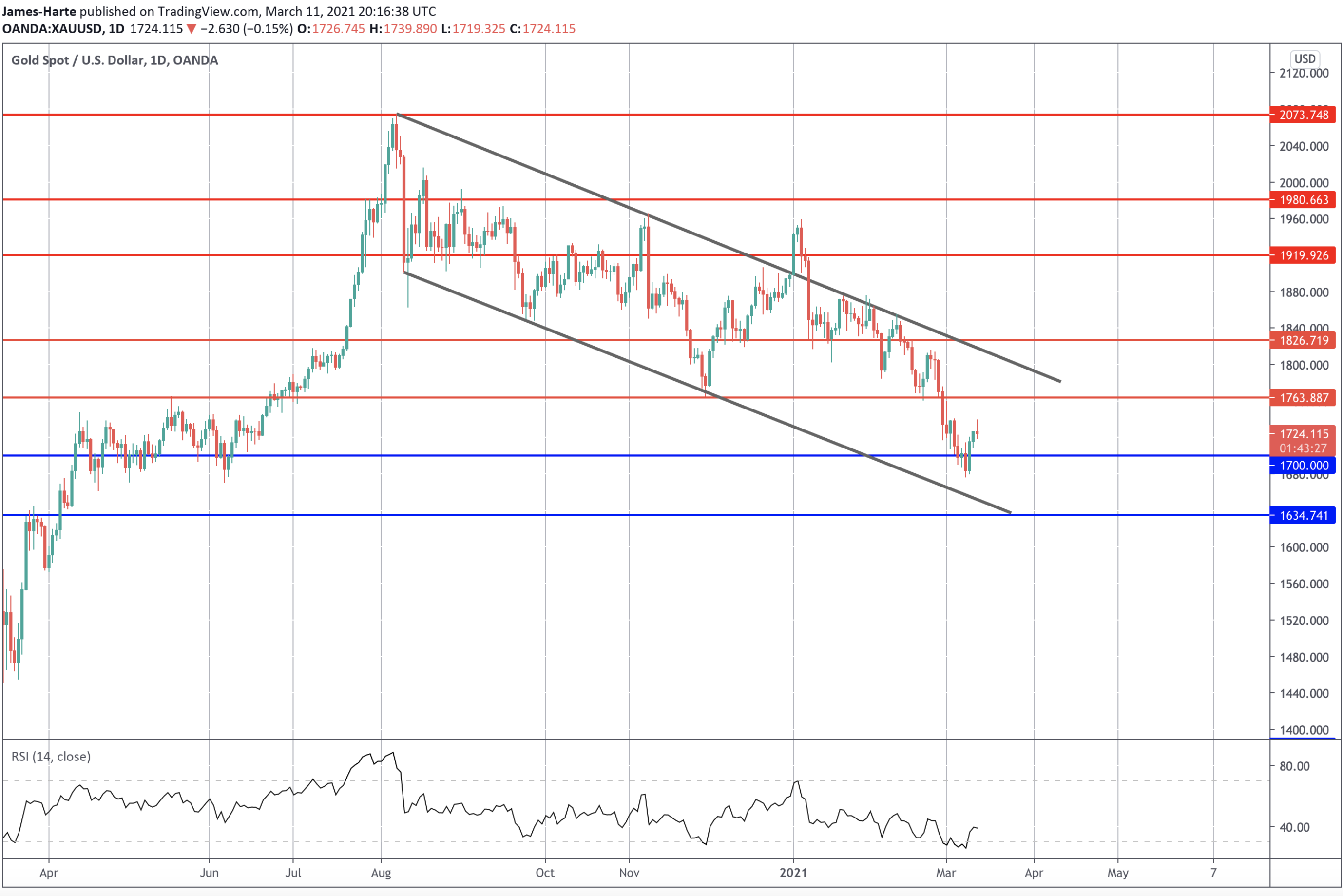 شهد الارتفاع الحاصل في أسعار الذهب هذا الأسبوع عودة السوق للتداول من جديد أعلى المستوى ١٧٠٠ بعد تحرك قصير المدى ما دون هذا المستوى. ويتم تداول السعر الآن مرة أخرى داخل منتصف القناة الهابطة من أعلى مستويات عام ٢٠٢٠. وفي حين أن السعر يستقر ما دون المستوى ١٧٦٣.٨٨، فإن التوقعات على المدى القريب تميل نحو مزيد من الهبوط يستهدف المستوى ١٦٣٤.٧٤.