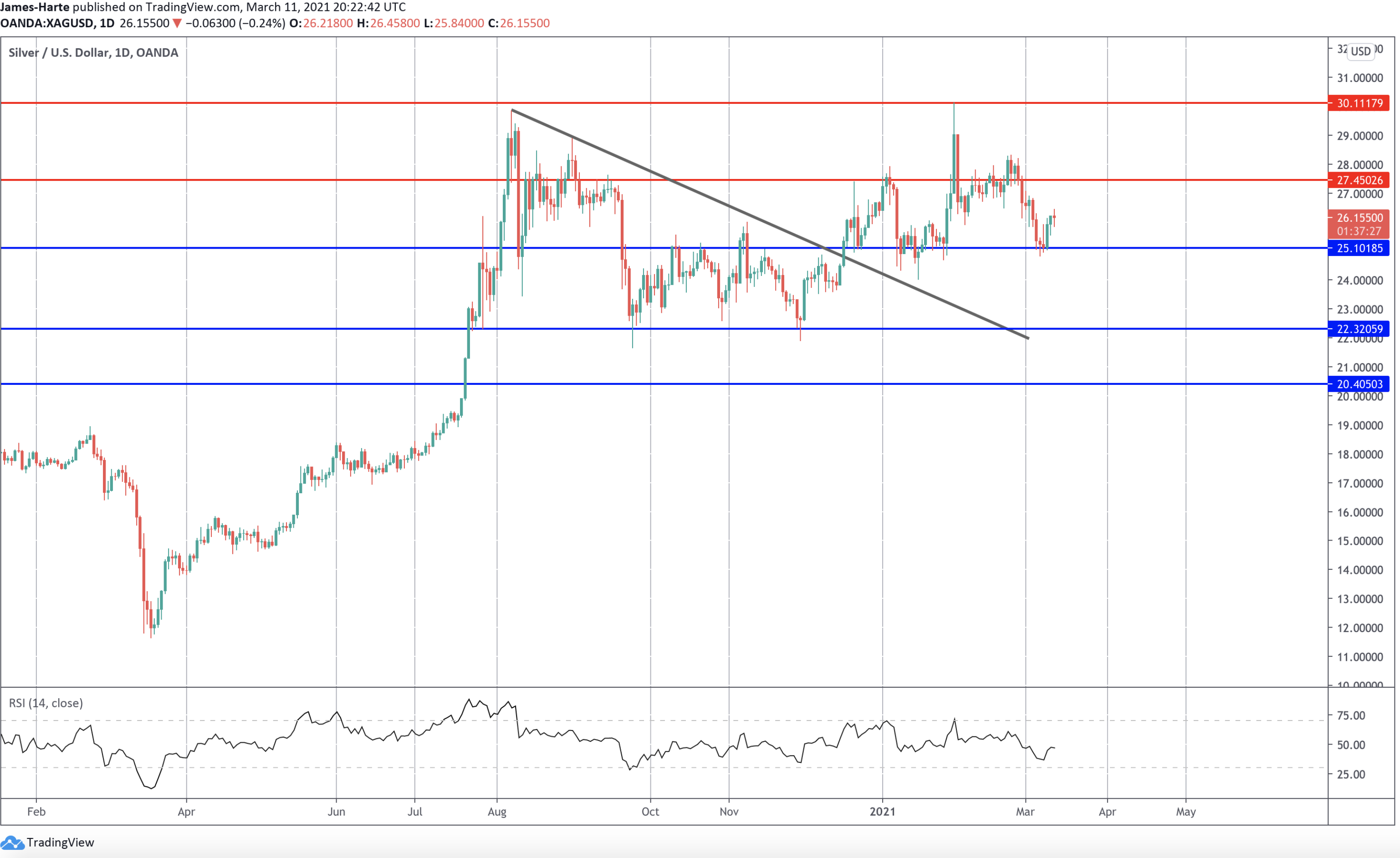 وسيحتاج المضاربون على قوة الفضة إلى رؤية اختراق فوق هذا المستوى لاستعادة الزخم من تجاوز أعلى خط الاتجاه المخترق من أعلى مستويات عام ٢٠٢٠.