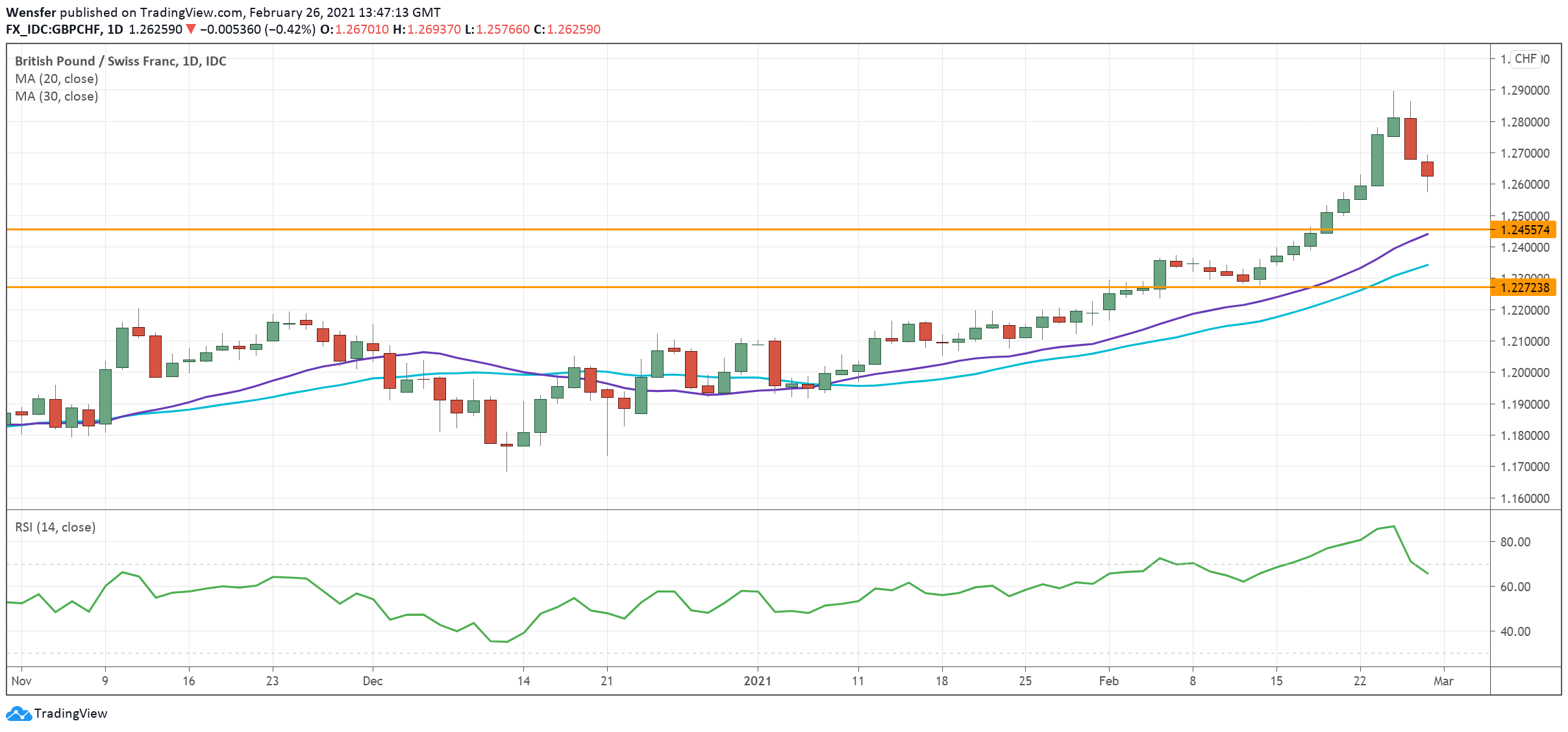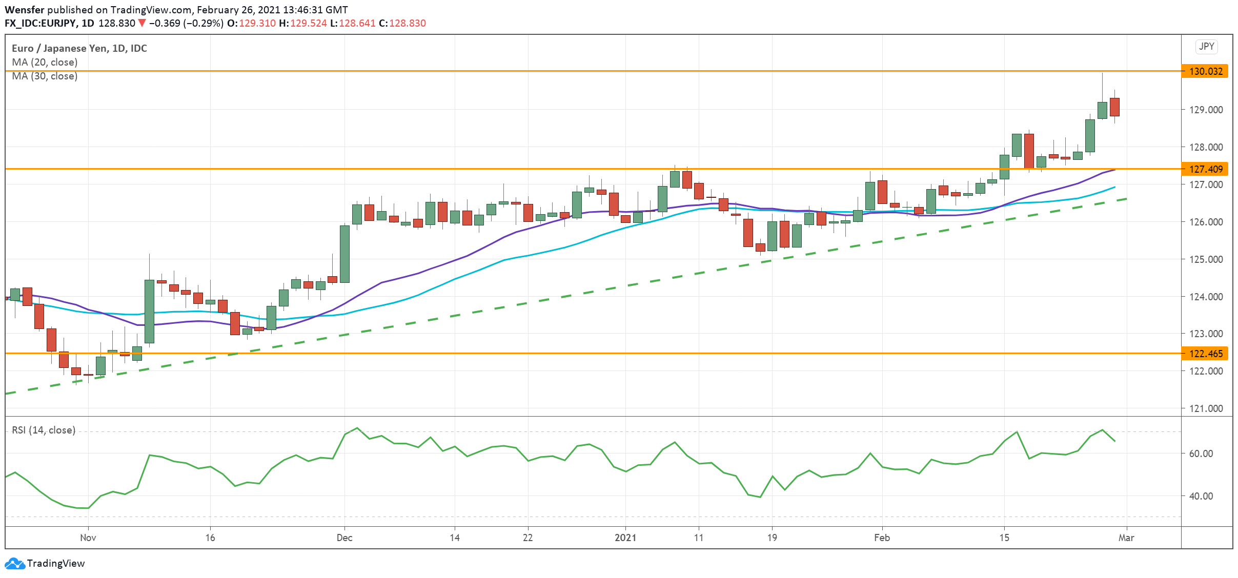 وقد ارتفع الجنيه الإسترليني فوق مستوى ما قبل الوباء عند ١.٢٨٠٠ ويلوح المستوى ١،٣٢٠٠ في الأفق. وسيكون المستوى ١.٢٤٥٠ الواقع حول المتوسطات المتحركة هو الدعم المباشر.