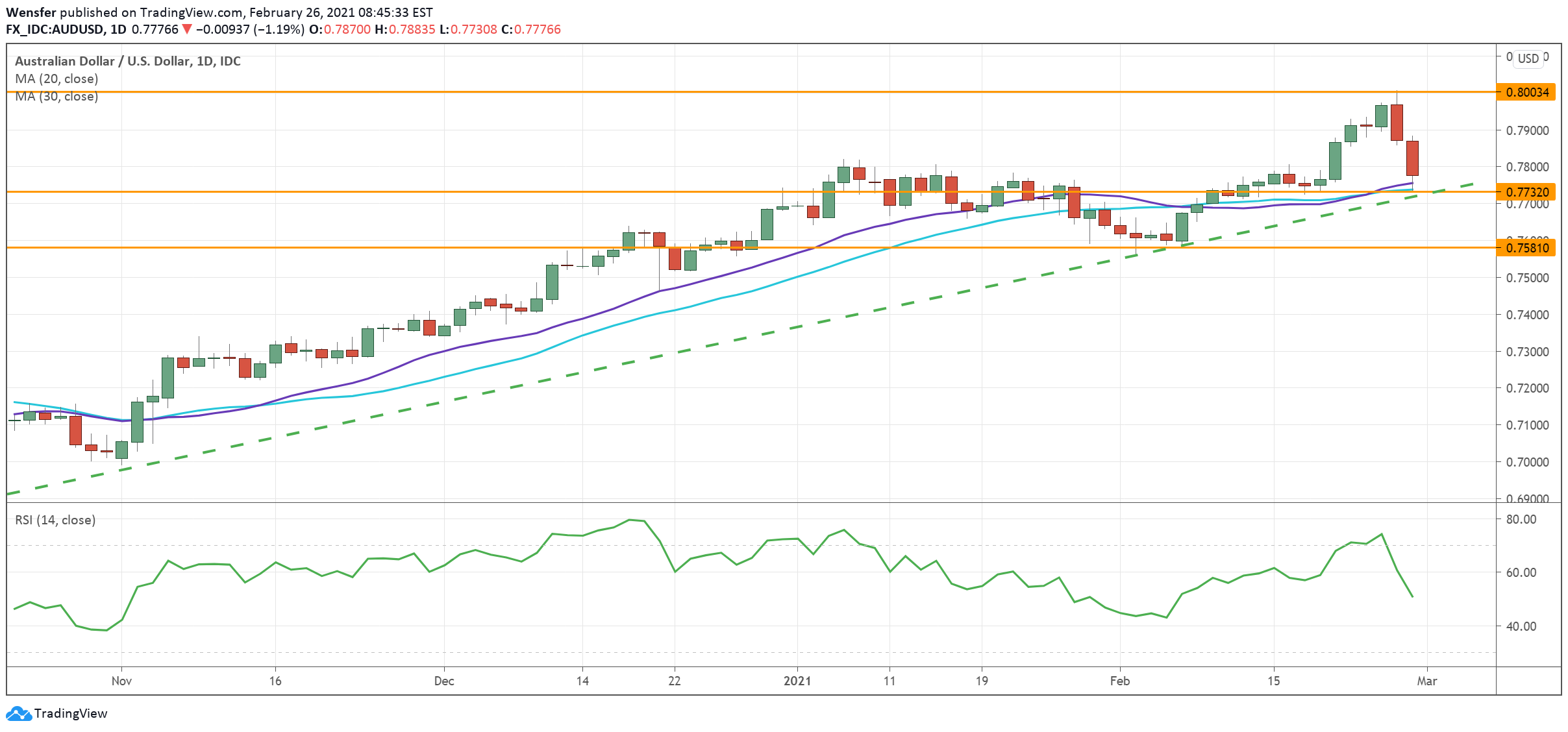 ويختبر الزوج المستوى ٠.٧٧٣٠، وهي منطقة التقاء حيث تلتقي المتوسطات المتحركة مع خط الاتجاه الصاعد. وقد يؤدي الاختراق السلبي إلى إضعاف الاتجاه الصاعد الذي دام ١١ شهراً وقد يؤدي إلى بدء عملية التصحيح.