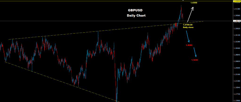 أي إغلاق يومي تحت مناطق 1.3700 سيعيد ضغوط الموجه الهابطة نحو مناطق 1.3600 و 1.3450