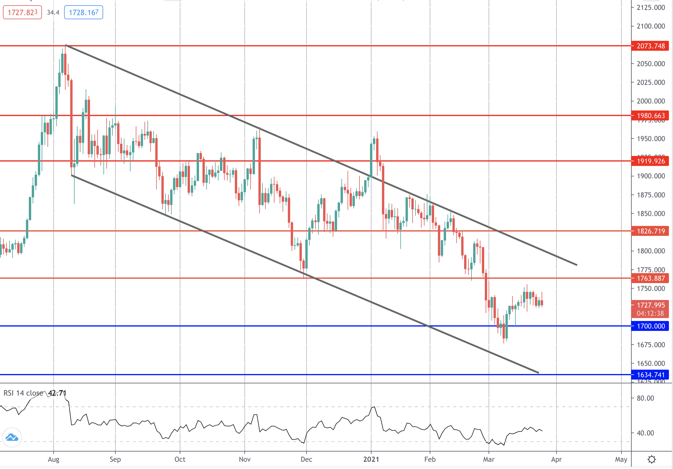 لا تزال أسعار الذهب في الوقت الحالي مستقرة في منتصف القناة الهابطة من أعلى المستويات التي شهدها في العام الماضي. ولا يزال السعر مستقراً فوق المستوى ١٧٠٠ حالياً.
