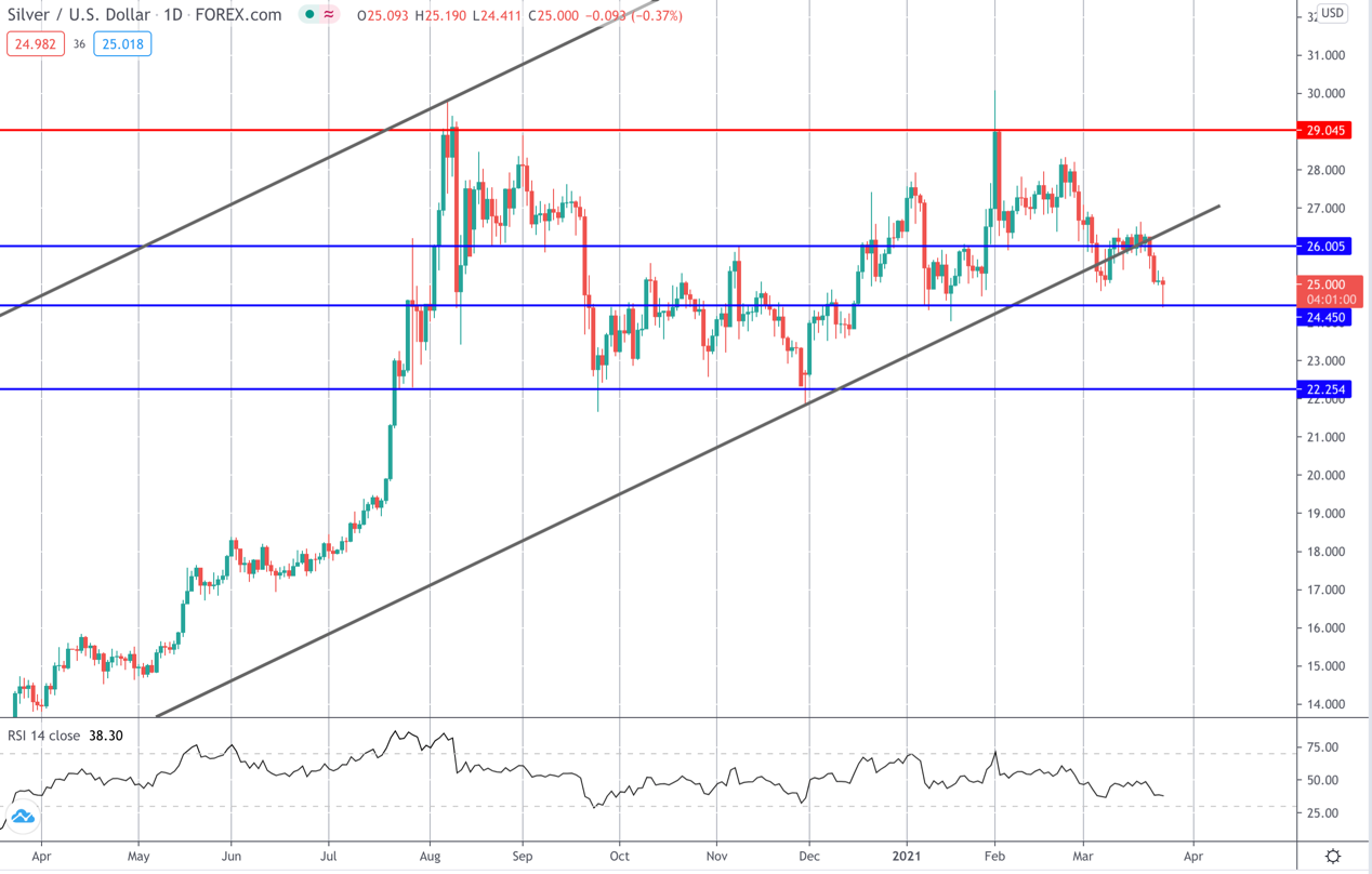 ومع ذلك، فإن الضعف في أسواق الأسهم وتأثير انقطاع الامداد في قناة السويس كان له أثره على الفضة في هذه المرحلة، وهو ما أدى إلى انخفاض الأسعار. ويتماسك السعر عند الدعم في الوقت الحالي.