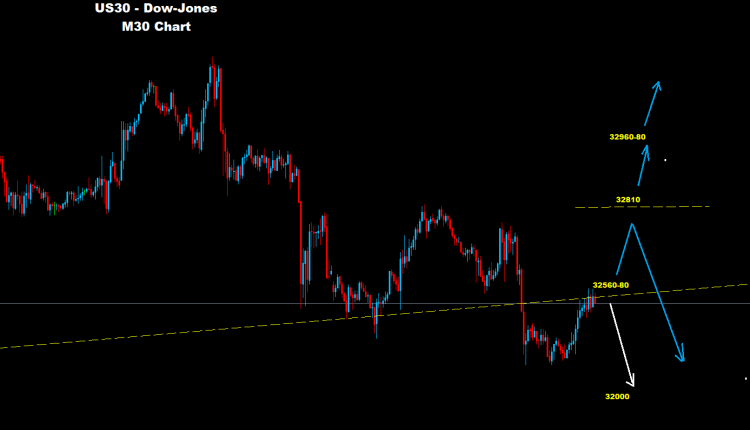 فوق مستويات 32580 فإن فرص مزيد من التقدم والارتفاع قد تطرأ على السوق مع تواجد مستويات مقاومة أخرى على مناطق 32810 والتي بدورها قد تدفع بموجة تراجع وهبوط نحو مستويات 32270 أو 32000