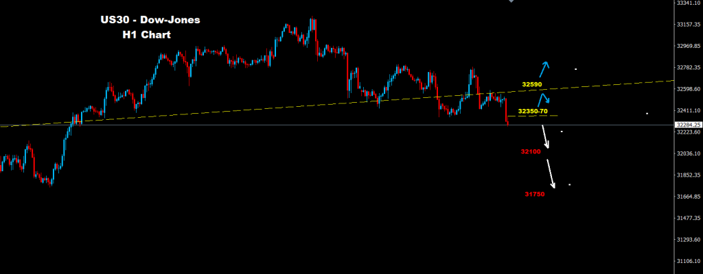 كما نرى على الرسم البياني فإن السوق يواجه الآن مستويات مقاومة أولى على مناطق 70-32350 و مناطق 32590 حيث وطالما السوق متماسك تحت احدى تلك المستويات فإن مزيد من التراجع والهبوط سيكون متوقع نحو اهداف 32100 و 31750