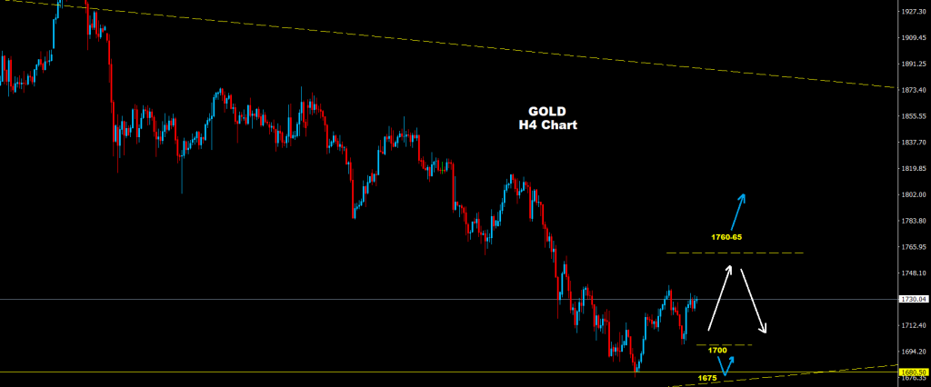 كما نرى على الرسم البياني فإن الذهب يواجه مستويات دعم حول مناطق 1700 و1675 في حين تتواجد مستويات المقاومة على مناطق 1740 و 65-1760