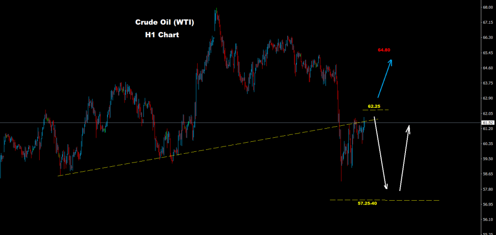 نجح النفط الخام بالحفاظ على تداولاته تحت مستويات المقاومة 62.25 حيث نجح بالتوجه لموجة تراجع جديدة والتي تواجه أولى مستويات الدعم للمدى اليومي حول مناطق 58.25