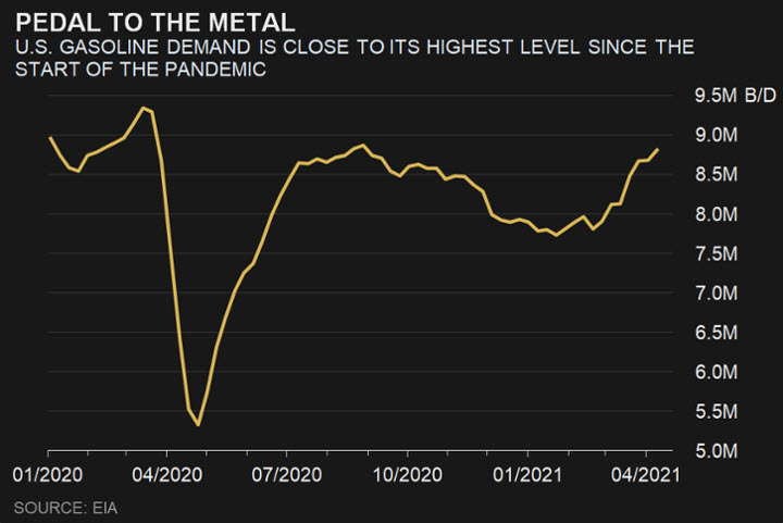 قد أدى تخفيف القيود في الولايات المتحدة والمملكة المتحدة إلى انتعاش كبير في الطلب على وقود الطرق، ولا سيما البنزين المستخدم لتشغيل المركبات الخاصة في شحنات الولايات المتحدة منذ أن بدأ الوباء.