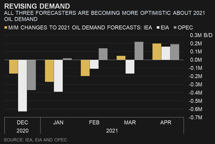 شهدنا هذا الشهر تفاؤل عام في أحدث التقارير الشهرية لمنظمات الطاقة العالمية بعد أن رفعت وكالة الطاقة الدولية ومنظمة أوبك ووكالة إدارة معلومات الطاقة الأمريكية تقديراتهم للطلب على النفط لعام 2021.